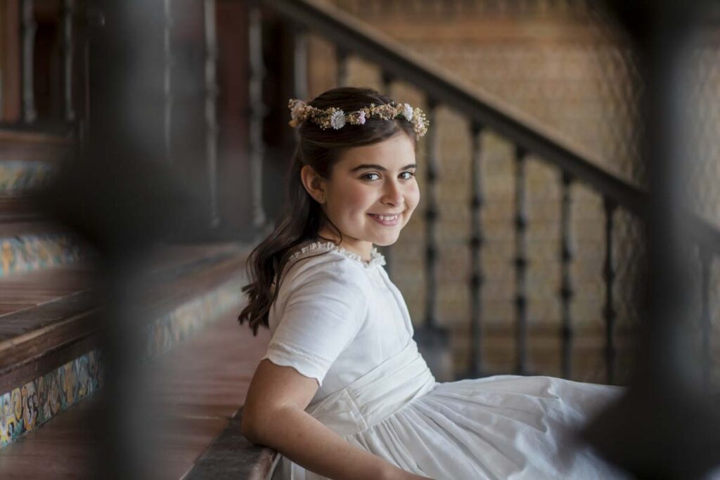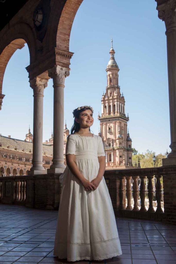 Su reportaje de comunión fue una aventura de las que me gustan: natural, divertida y sin poses forzadas. Nos dimos un paseo por la Plaza de España y el Parque de María Luisa, ese rincón que parece hecho para que todo salga bien en las fotos. Luz dorada, reflejos en el agua, la brisa moviendo el vestido… y Inés, feliz, disfrutando de su día.